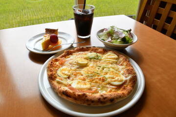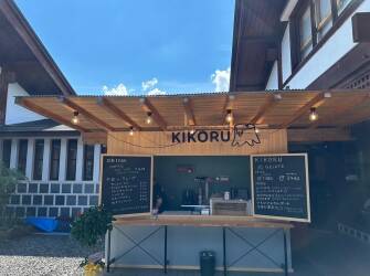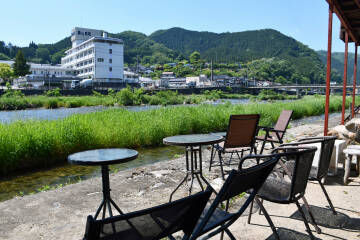ひめのもちを使った牛餅丼をはじめ、新庄村産の食材をふんだんに使用した料理を提供しています。また、おとなりのテイクアウトコーナーでは、ピザやコーヒーなどカフェメニューもあります。心地よいテラス席で頂けます。
