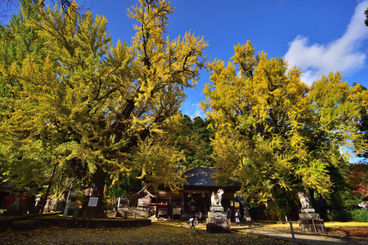 境内にある「大銀杏」は、どちらも推定樹齢650年の巨木で、秋の紅葉シーズンには境内一面を黄色い絨毯が彩ります。