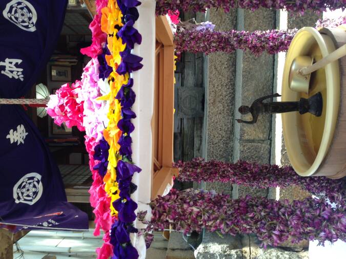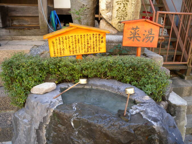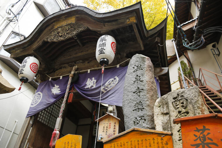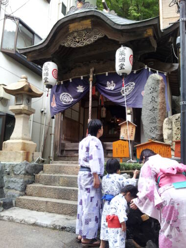 温泉街の中央に位置する温泉薬師堂。温泉薬師堂には、親指ほどの薬師如来さまが祀られています。昔々大水害で、本堂と本尊もろとも流されてしました。そして本尊が、ここからおよそ80キロ離れた下流にいた釣人に拾われ、湯原に帰ってきました。そのような由来から『健康かえる』、『銭かえる』のお薬師様として信仰を集めています。毎年5月8日には花まつりが行われ、普段は本堂の奥に祀られている親指ほどの薬師如来像が年に一度、この日だけ姿を見ることができます。