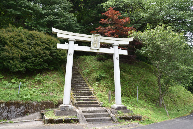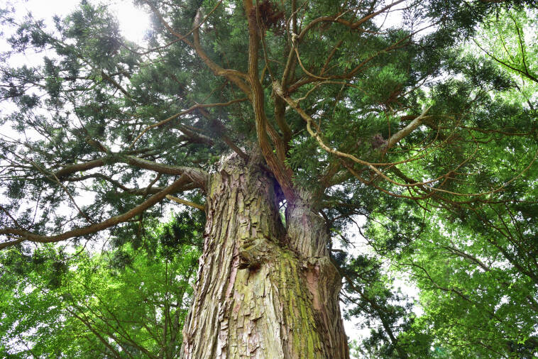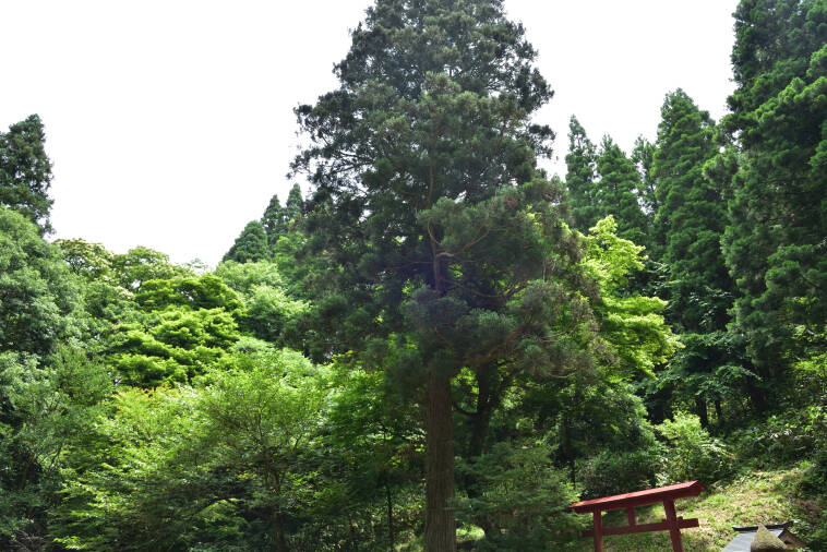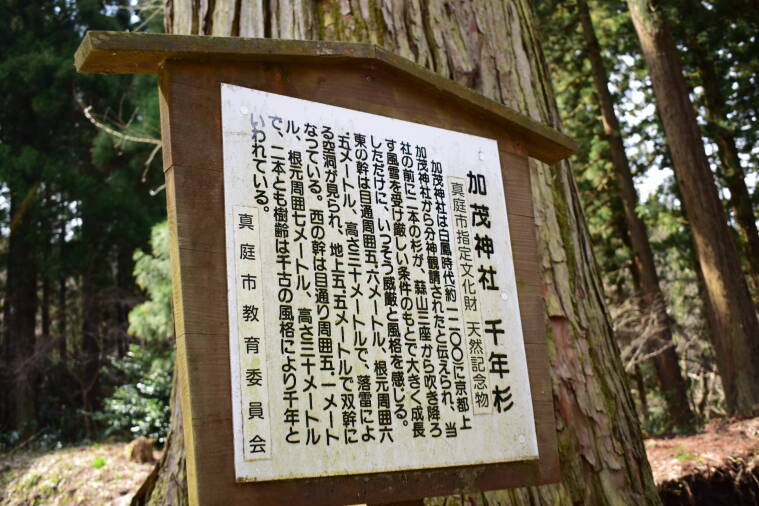 社の前にある杉は''千年杉''とよばれ、蒜山三座から吹きおろす風や雪を受けて、大きく成長したといわれています。