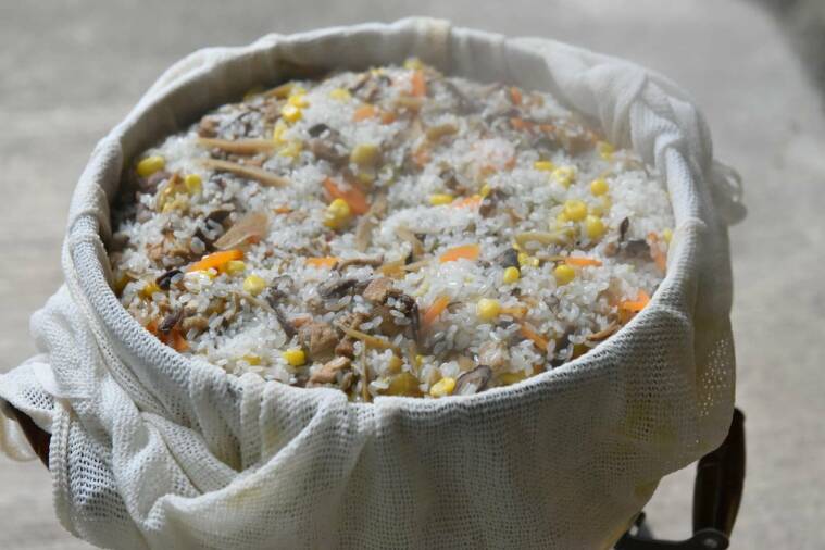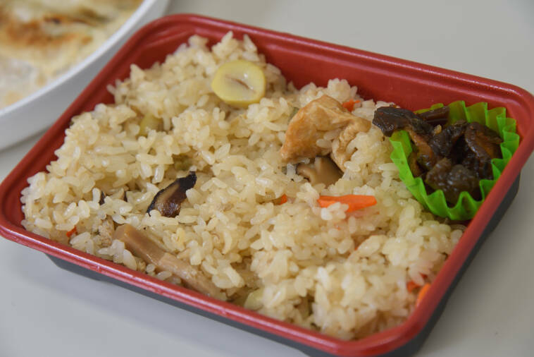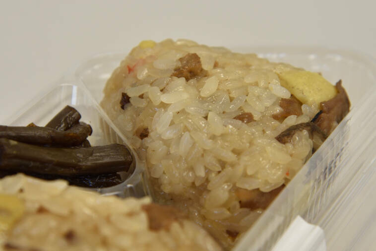 もち米に鶏肉、油揚げ、椎茸、フキ、ゴボウ、人参、栗などの材料をふんだんに使ったおこわで、醤油味の風味に素材のうまみが上品に調和し、食欲をそそります。