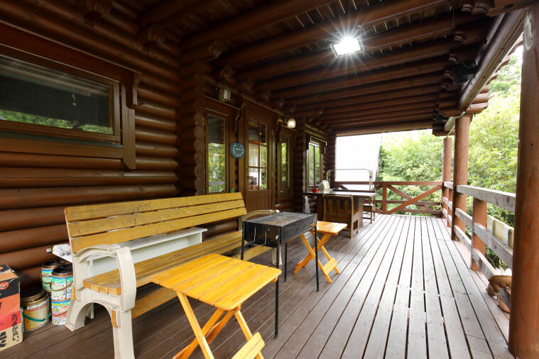 リビングから20㎡のウッドデッキに出られ、この屋根のある下でバーベキューなどを雨の日でも楽しめます。また、愛犬がいなくても宿泊可能ですが、犬猫アレルギーの方はご遠慮ください。