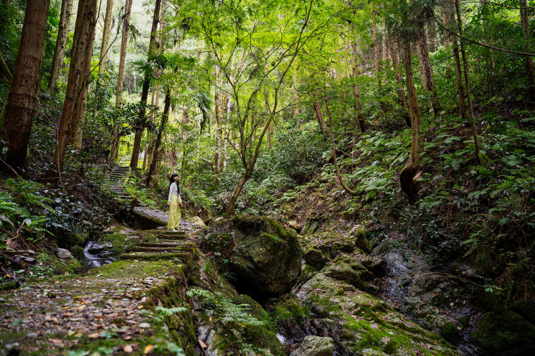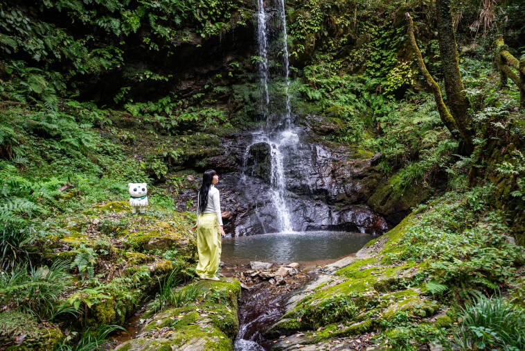 そばに毘沙門天の祠があることから「毘沙門の滝」として親しまれている、落差約10mの滝。水の少ない時期には滝が二条になって流れ落ちることから、「夫婦滝」とも呼ばれます。
