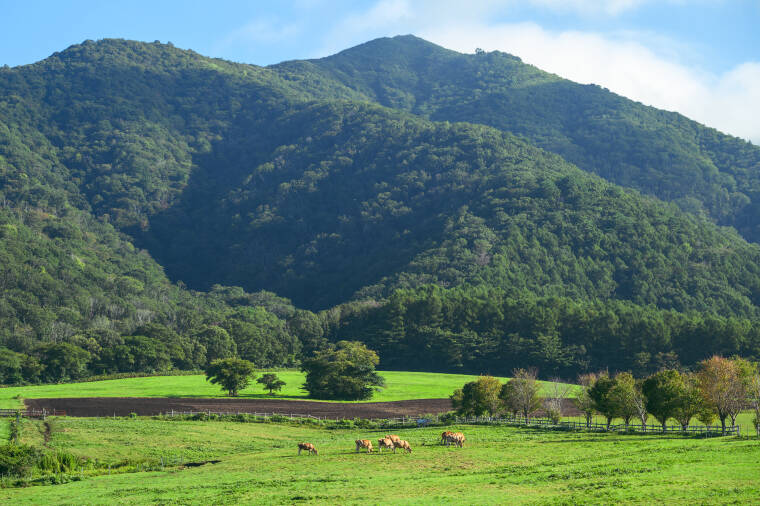 ひるぜんジャージーランドは、蒜山三座の一つ、上蒜山の南麓に位置し周囲は広大な牧草地に囲まれています。一面に緑が広がり開放感溢れる牧草地には愛らしいジャージー牛が放牧されています。