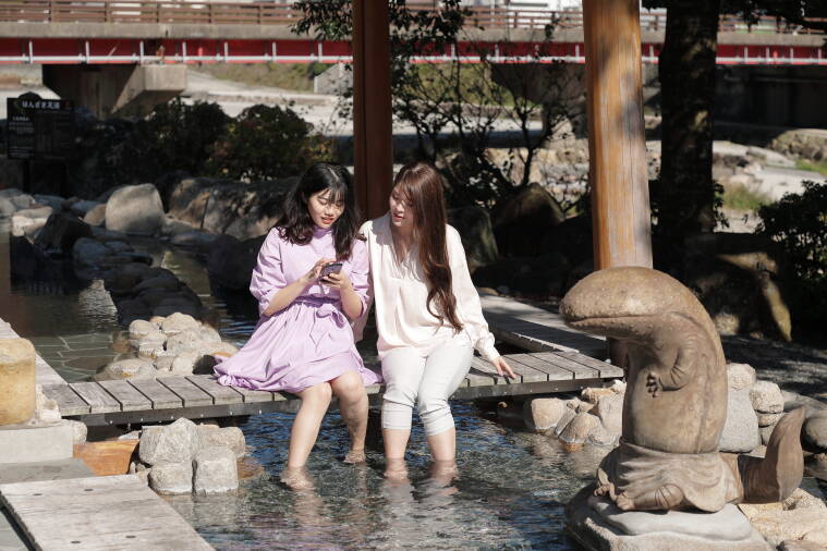 温泉街の真ん中、つづみ橋のふもとにある足湯。