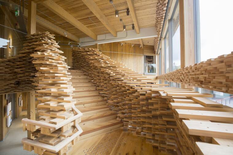 GREENableHIRUZENは、2021年7月に東京晴海から真庭へ里帰りした建築家隈研吾氏デザイン・監修の建物です。木材は全て真庭産・製造も真庭でされたCLTを使用しております。建築後解体ではなく、移築して新たに使用できる建築物です。CLTを使った木工体験では、CLTの端材からスマホスタンドまたはペン立てを制作致します。紙やすりで角を削るだけなので誰でも簡単に制作できます。