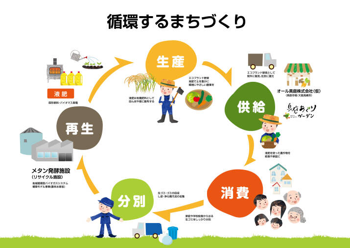 真庭市では、一般家庭から出る生ごみなどをメタン発酵させ液体肥料「バイオ液肥」として再生し地域内での資源循環を目指します。
