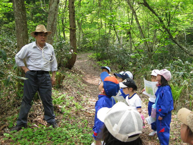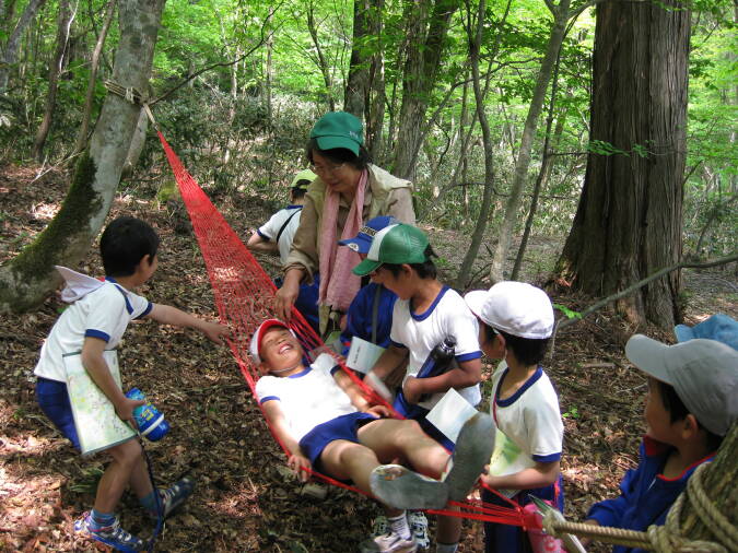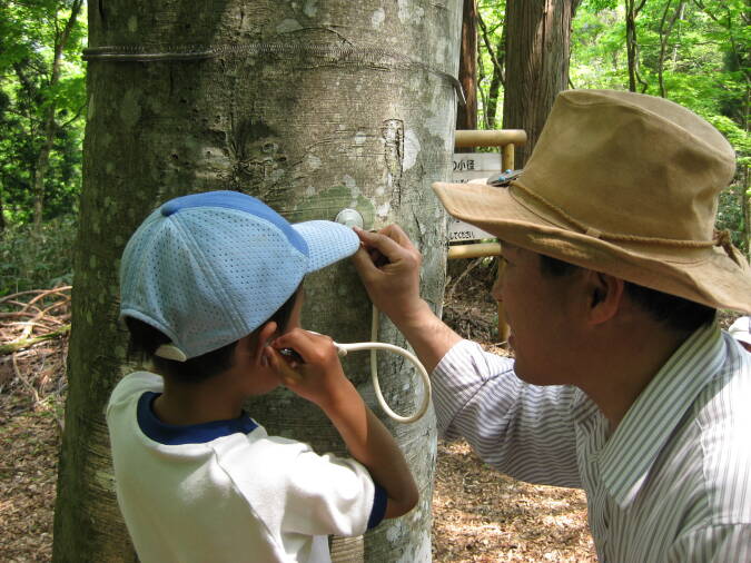 森の癒し効果が科学的に実証・認定された新庄村の「森林セラピー基地」。五感の感覚を敏感に働かせ、森のパワーを全身に取り込むことでことで、心身のバランスを整えていく森林セラピー体験。教育旅行の体験で大好評です。