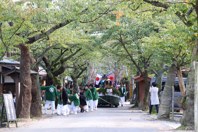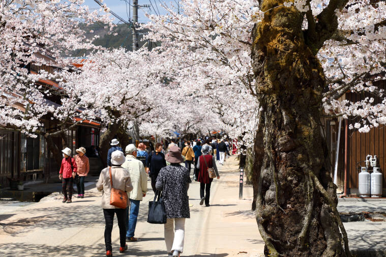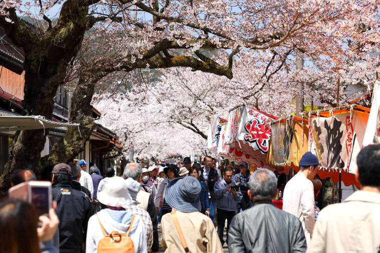 「がいせん桜」は明治39年、宿場町の街道の両側に日露戦争での戦勝を記念して桜が植えられました。5.5mおきに約130本の桜が咲揃う素晴らしい桜並木のトンネルは、新庄村の春を代表する景色です。