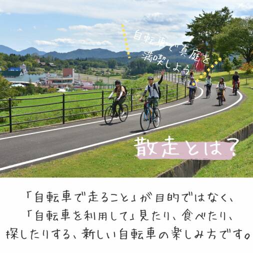 「自転車で走ること」が目的ではなく、「自転車を利用して」見たり食べたり探したりすることを目的とした、新しい自転車の楽しみ方です。徒歩よりも広範囲に、車よりもゆったりと周囲の景色を眺めながら「真庭」での様々な発見や出会いをお楽しみください。