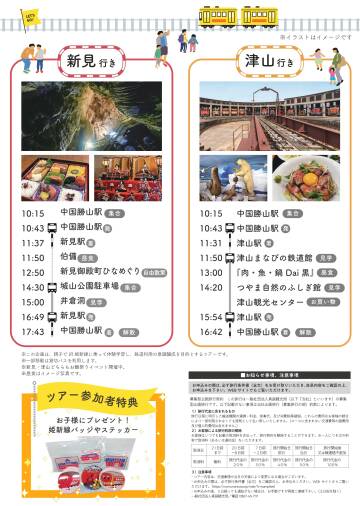 JR中国勝山駅(10:15)集合/姫新線津山行き乗車(10:43発)==JR津山駅(11:31)==津山まなびの鉄道館==『肉・魚・鍋Dai黒』《昼食》==つやま自然のふしぎ館==JR津山駅==JR中国勝山駅(16:42) 解散