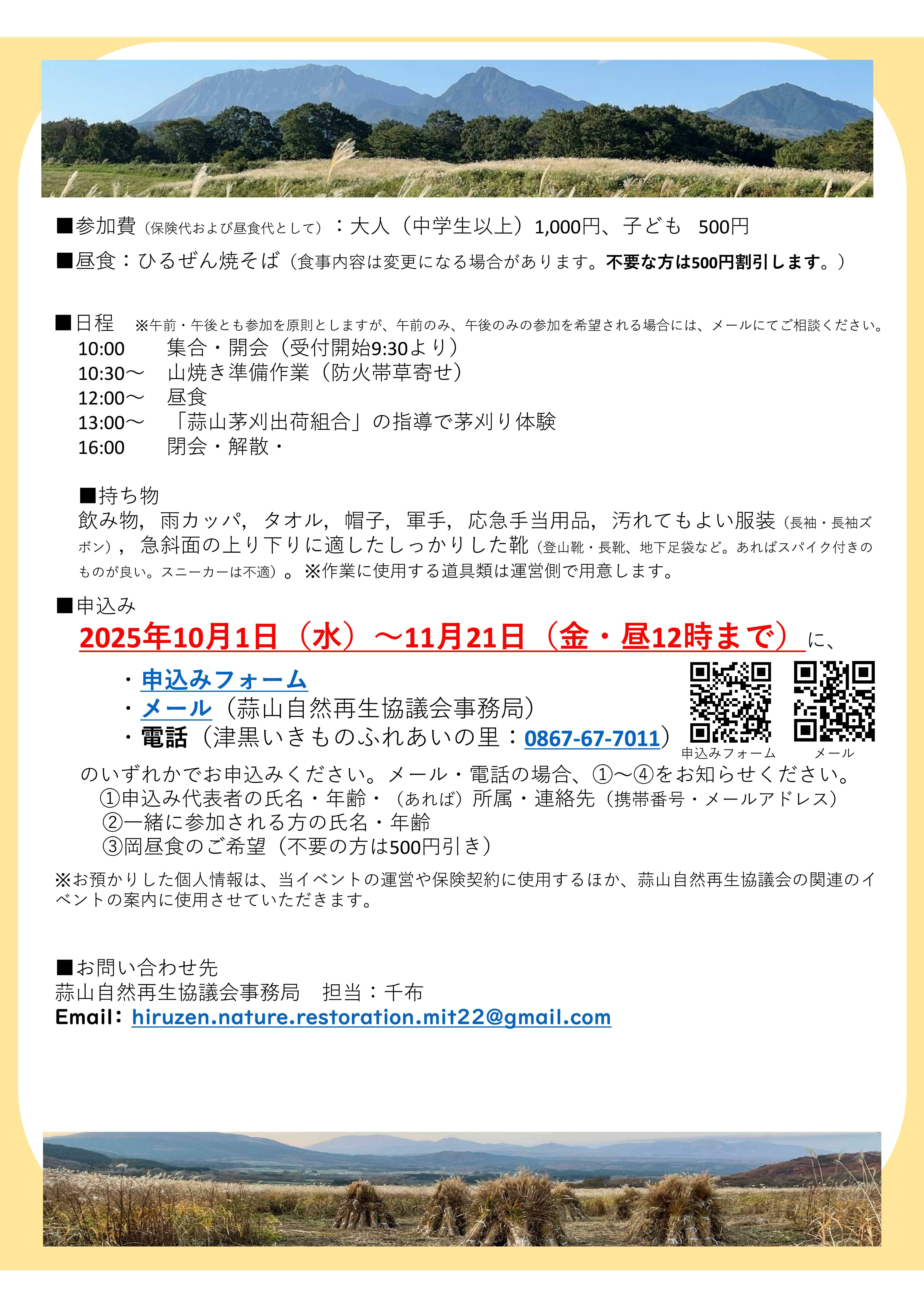 貴重な草原の動植物をまもるためのボランティア活動と、茅刈りのわざを学べる、秋の蒜山の自然をめいっぱい体験できるイベントです!