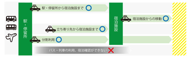 最寄り駅から宿泊施設まで、または宿泊施設からの帰路など。タクシー1台につき運賃の半額を助成。
