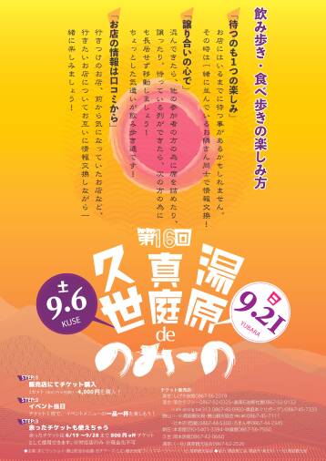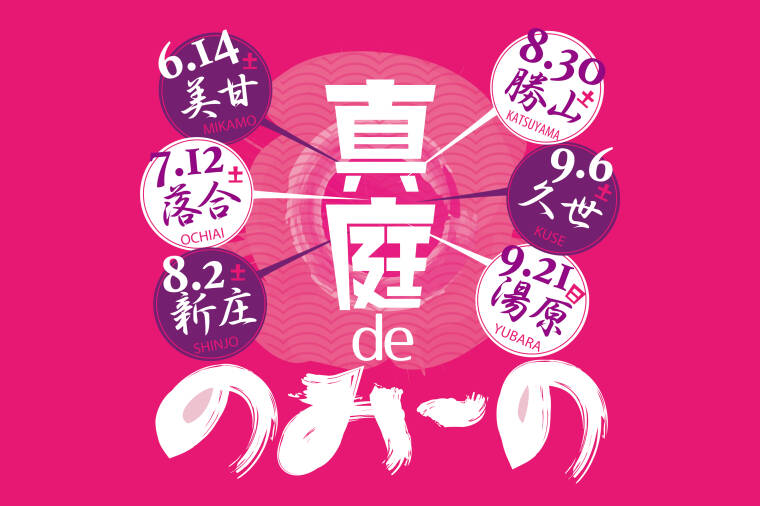 夏に開催される真庭の飲み歩きイベント。本年より『真庭deのみ~の』と題し、新たに美甘・湯原が加わり、