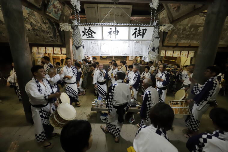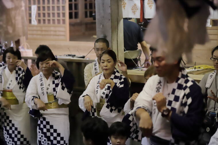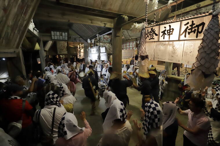 中でも一番にぎやかになる福田神社では、夜には花火大会も。種類は“あおい”、“しっし”、“まねき”の三つ。ゆったりとしたリズムで輪になって踊ります。