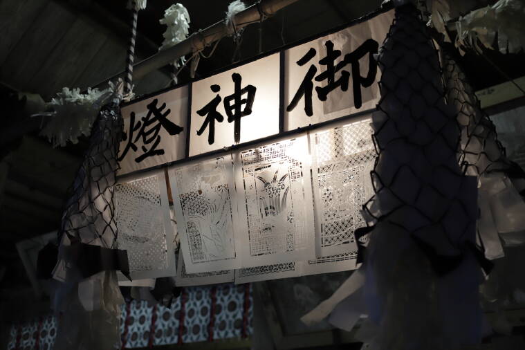 輪の中心に灯される大灯篭には“シリゲ”と呼ばれる切り絵細工が吊るされ、踊りの雰囲気を演出します。