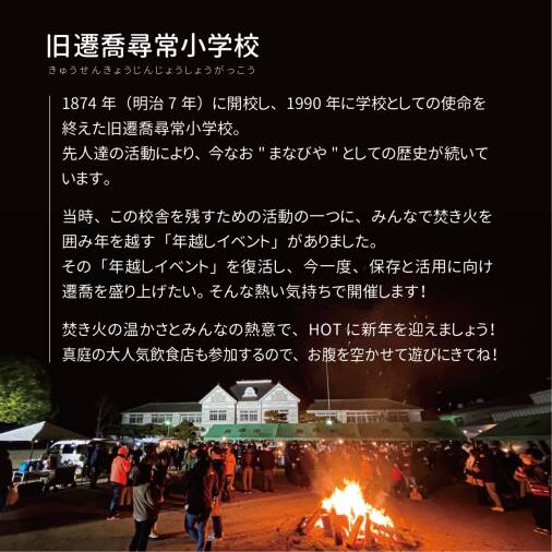 1874年(明治7年)に開校し、1990年に学校としての使命を終えた旧遷喬小学校。先人達の活動により、今なお"まなびや"としての歴史が続いています。当時、この校舎を残すための活動の一つに、みんなで焚き火を囲み年を越す「年越しイベント」がありました。