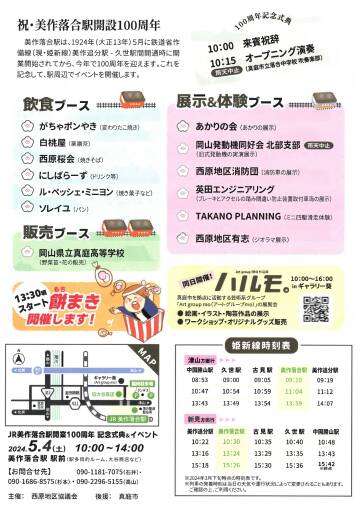 西原地区協議会では、美作落合駅開業100周年を記念して、記念式典及び記念イベントを開催します。