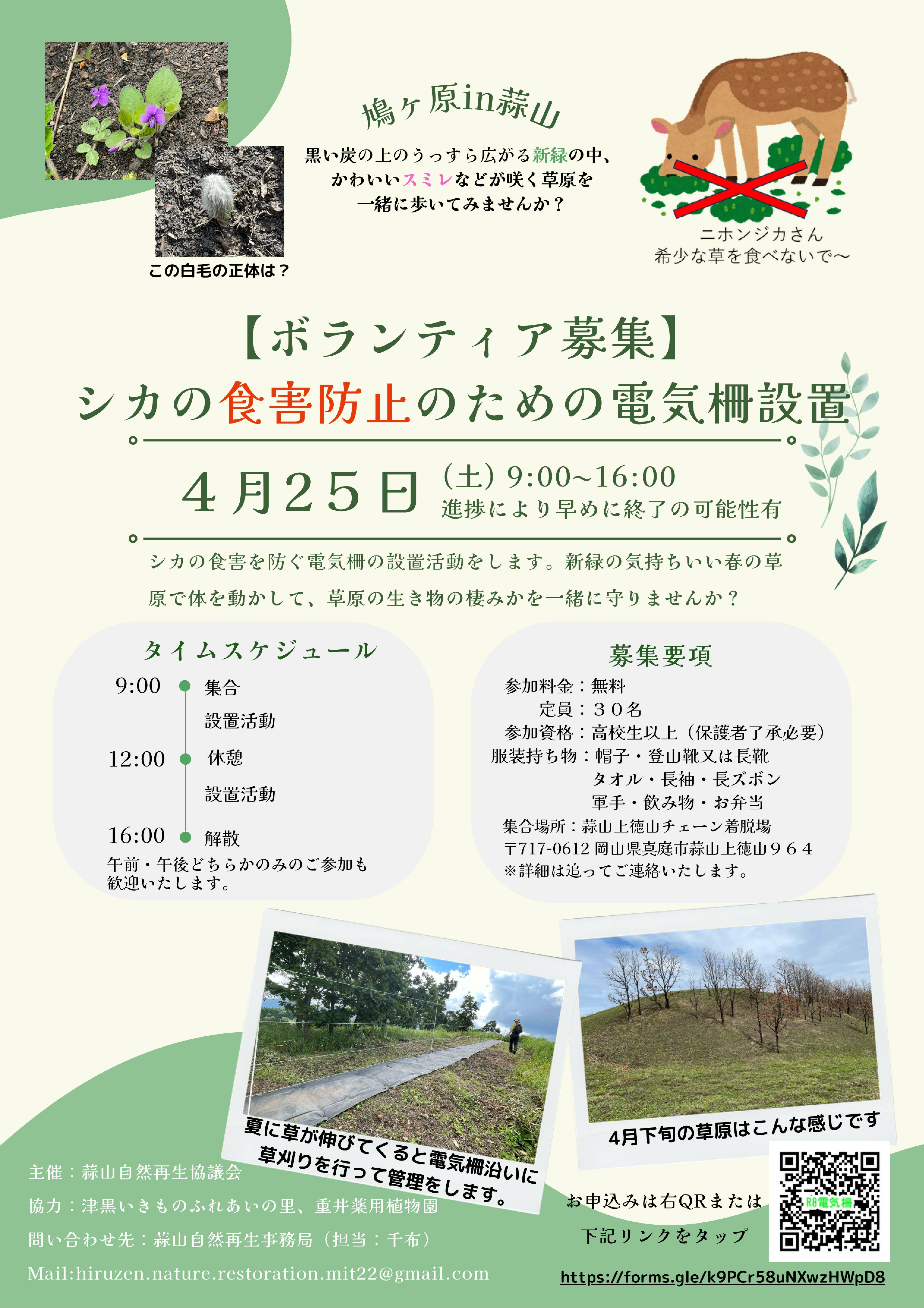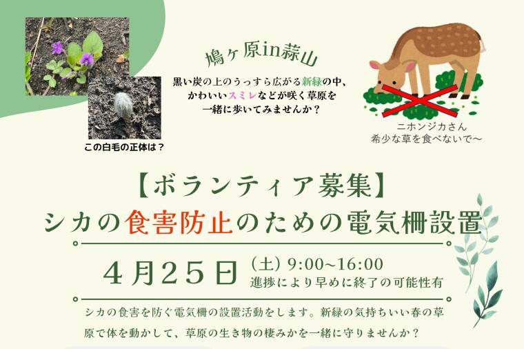 希少種や生態系、ひいては私たち人間の生活への悪影響を防止するために、一緒に防鹿柵となる電気柵の設置をしていただける方を募集します。ぜひ多くの方のご参加をお待ちしております。
