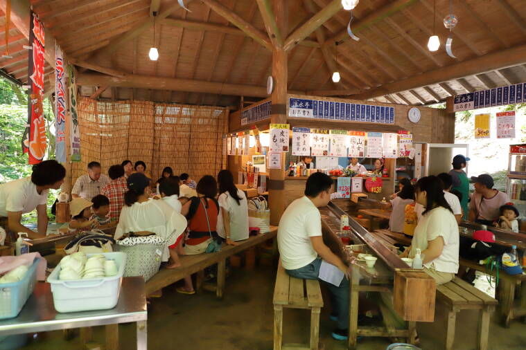 すぐそばにある不動滝の音を聞きながら、外界とはひと味違う、マイナスイオンいっぱいの中で食べるそうめんの味は格別です。