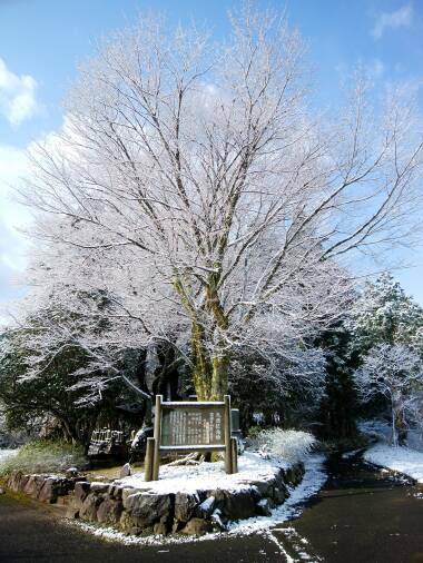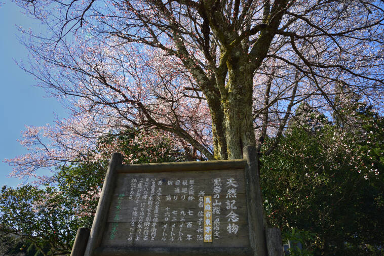 蒜山東茅部の黒岩集落に入り、人家を過ぎた突き当りに立っている山桜の巨木。