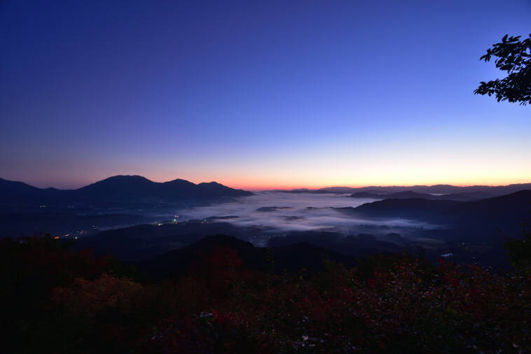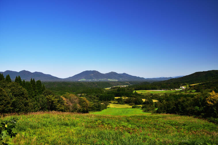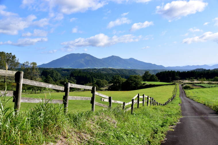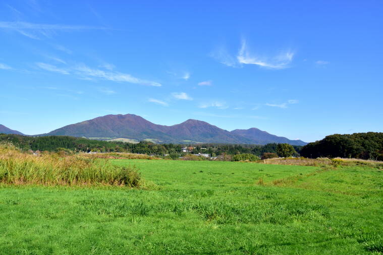 岡山県と鳥取県境、中国山地を織りなす大山連峰の東に連なる上蒜山(1,202m)中蒜山(1,123m)下蒜山(1,100m)の3つを蒜山三座と表現。特に上蒜山の山腹から山裾にかけての火山麓扇状地は、採草放牧地として利用され、雄大で牧歌的な風景を展開しています。
