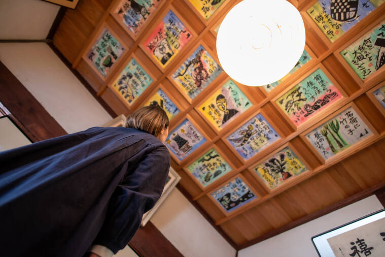 写経にと始めた趣味の版画を寺院の襖に貼ったのがきっかけに、今では襖絵・掛軸・天井版画など約300点あまりを展示。