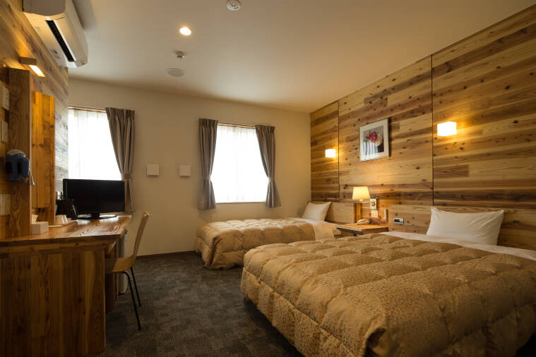 久世の中心部にほど近く、明るく清潔感のある館内。ビジネスや観光にピッタリの、全室ブロードバンド(有線)対応です。サロンのような部屋でどうぞごゆっくりとおくつろぎください。真庭で作られた木造建築材「CLT」で建てられた別棟もあり、木のぬくもりを感じられるお部屋となっています。