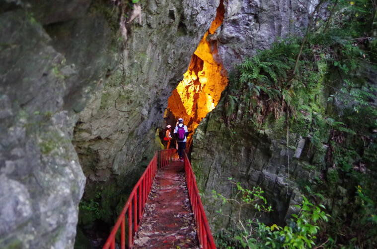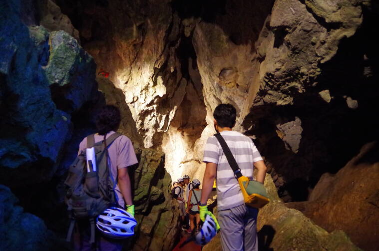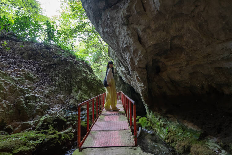 さまざまな形の鍾乳石の下を大量の水が流れ、多くの滝を形成している特異な鍾乳洞。新見市の日メ坂(ひめさか)鍾乳穴とつながっているともいわれています。洞内は約900m(見学できるのは約10m)、洞口は3m×4.5mで、雨が降ると多量の水が流れ出ます。岡山県の指定天然記念物。