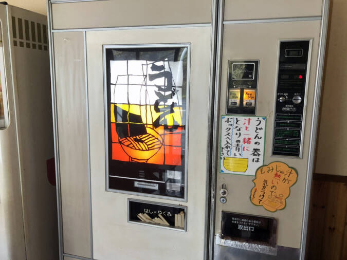 お店の横にあるベンダーコーナーにある「うどんの自販機」がひそかな人気で、遠方から訪れる人が絶えません。昭和を感じさせる即席うどんかと思いきや、中に入っている麺は隣のお店で打ったものと、これもこだわりの逸品です。