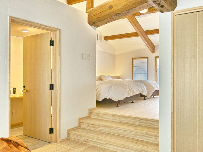 日本で最も美しい村・新庄村のメインストリートである「がいせん桜通り」。そのすぐ西にそびえる愛宕山の側に窓を大きくとったお部屋です。寝室とリビングスペースをつなぐ小上がりが印象的なつくりとなっています。四季の山肌の色彩を借景としつつ、町の喧騒をはなれて集中してなにかに取り組んだり、静かな場所でゆっくりと語らいたい方にお勧めのお部屋です。