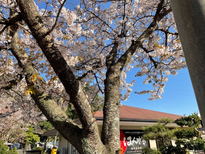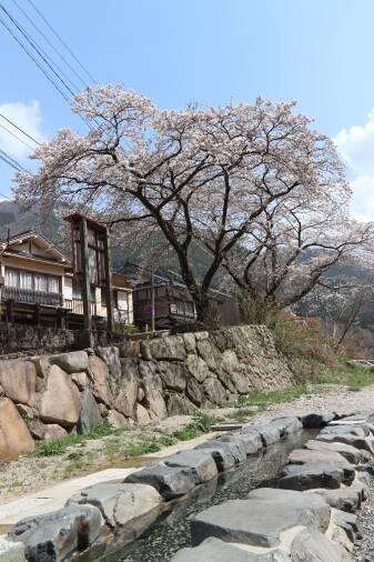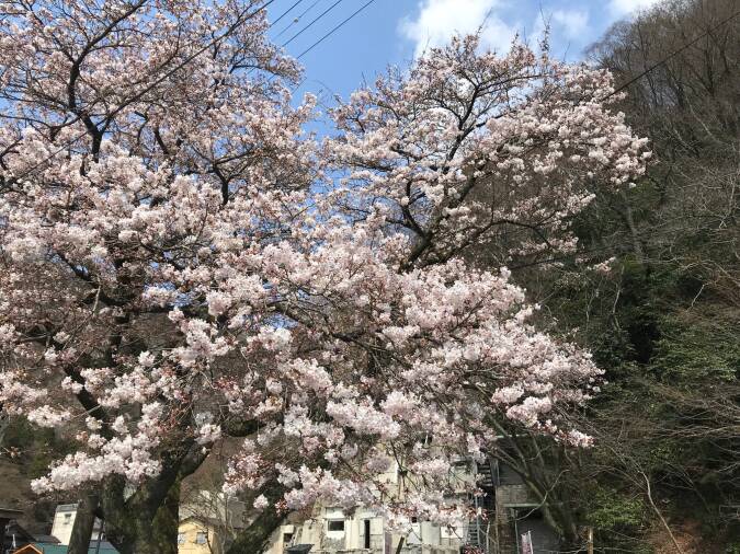 つづみ橋の下手にある桜。河川の足湯に浸かって見上げるのがおすすめです