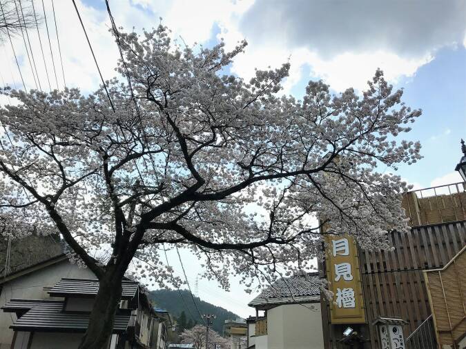 かつて湯原新地といわれた繁華街にそびえたつ桜