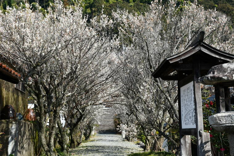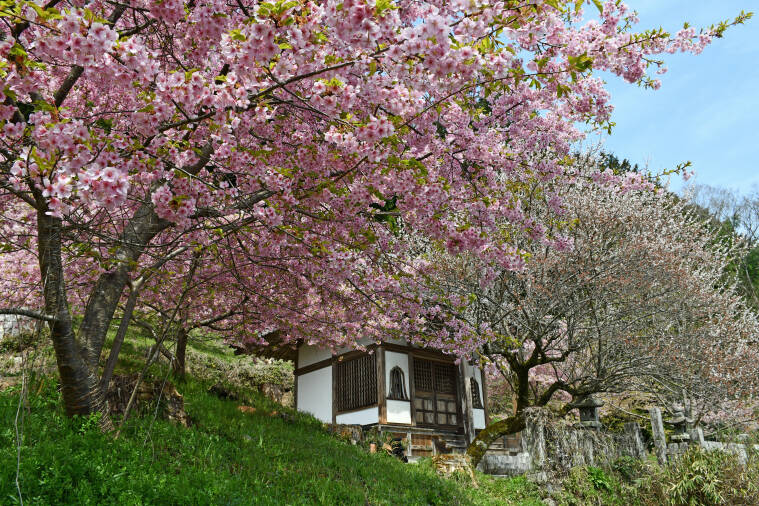 十一面観音菩薩を本尊とする曹洞宗の寺院。鎮守として九尾の狐・玉藻前伝説の殺生石が祀られています。春になると、梅の並木と裏山の河津桜が咲き並びます。(勝山の旧地名は高田です。)