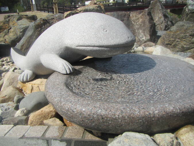 湯原温泉らしく、はんざき(オオサンショウウオ)の形をしており、