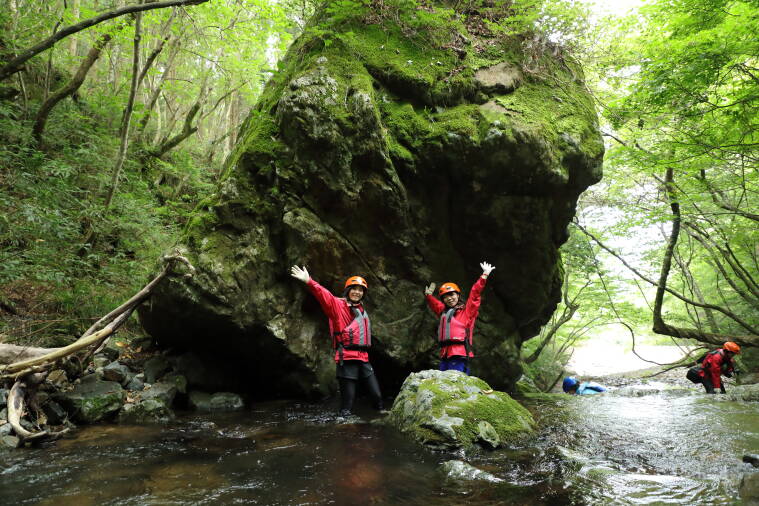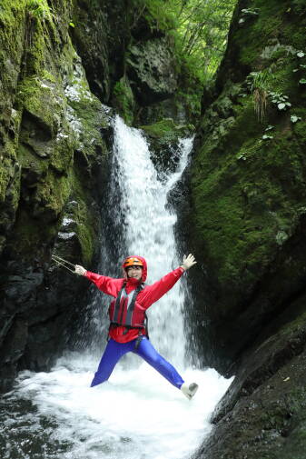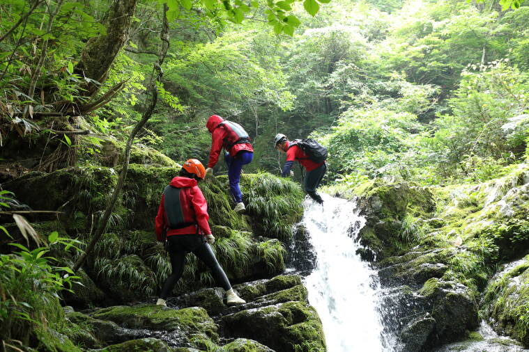蒜山エリアにある大自然の中での「リバートレッキング」は水飛沫を浴びなら沢を登っていく非日常体験。